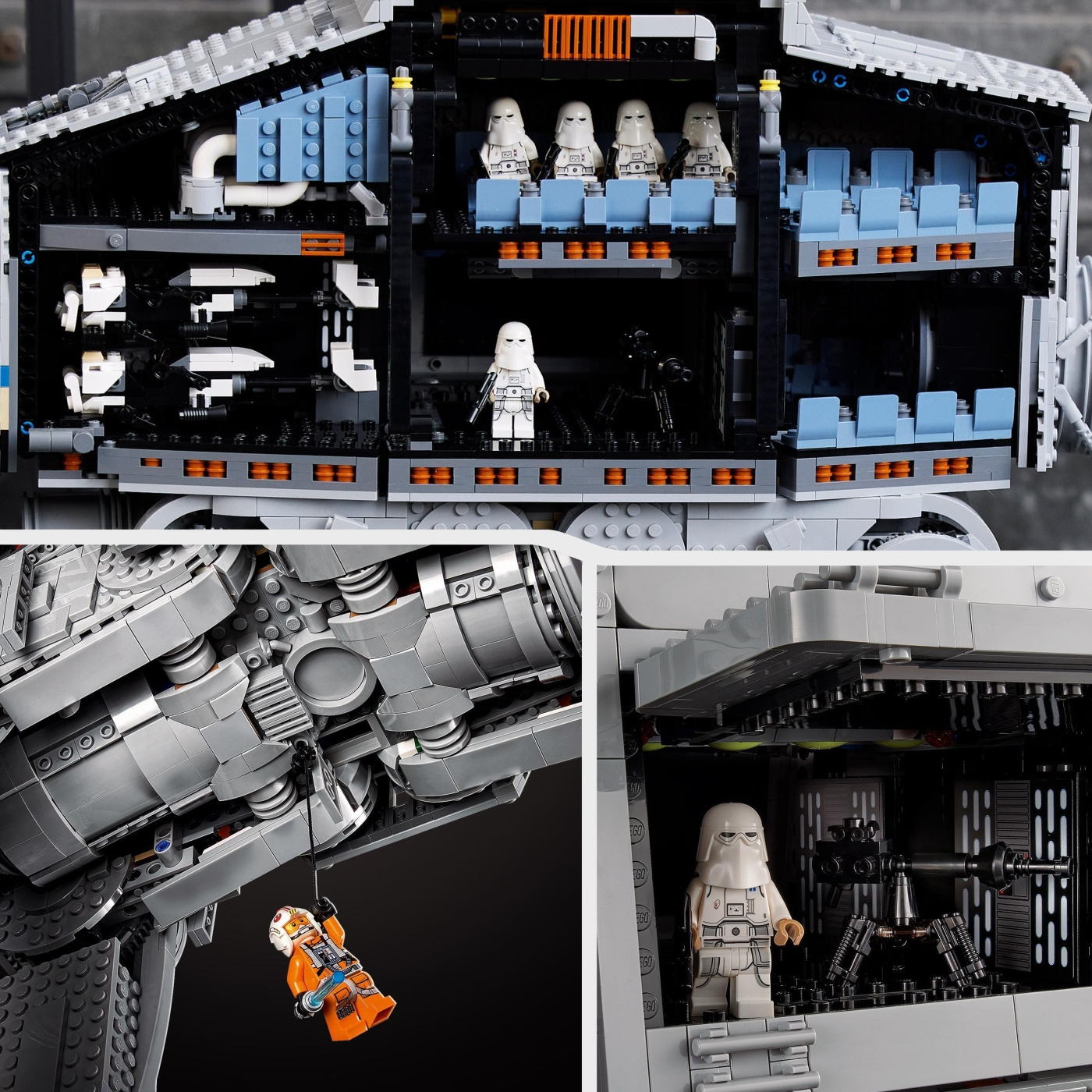 The AT-AT measures over 24.5 in. (62 cm) high and is easily opened to view the detailed interior. The main body has space for 40 LEGO minifigures (General Veers and Luke Skywalker are among 9 in this set), 4 speeder bikes (2 included) and the included E-Web heavy repeating blaster. The head/cockpit seats 2 LEGO minifigures and has space for 1 more. An information plaque completes a magnificent display piece.