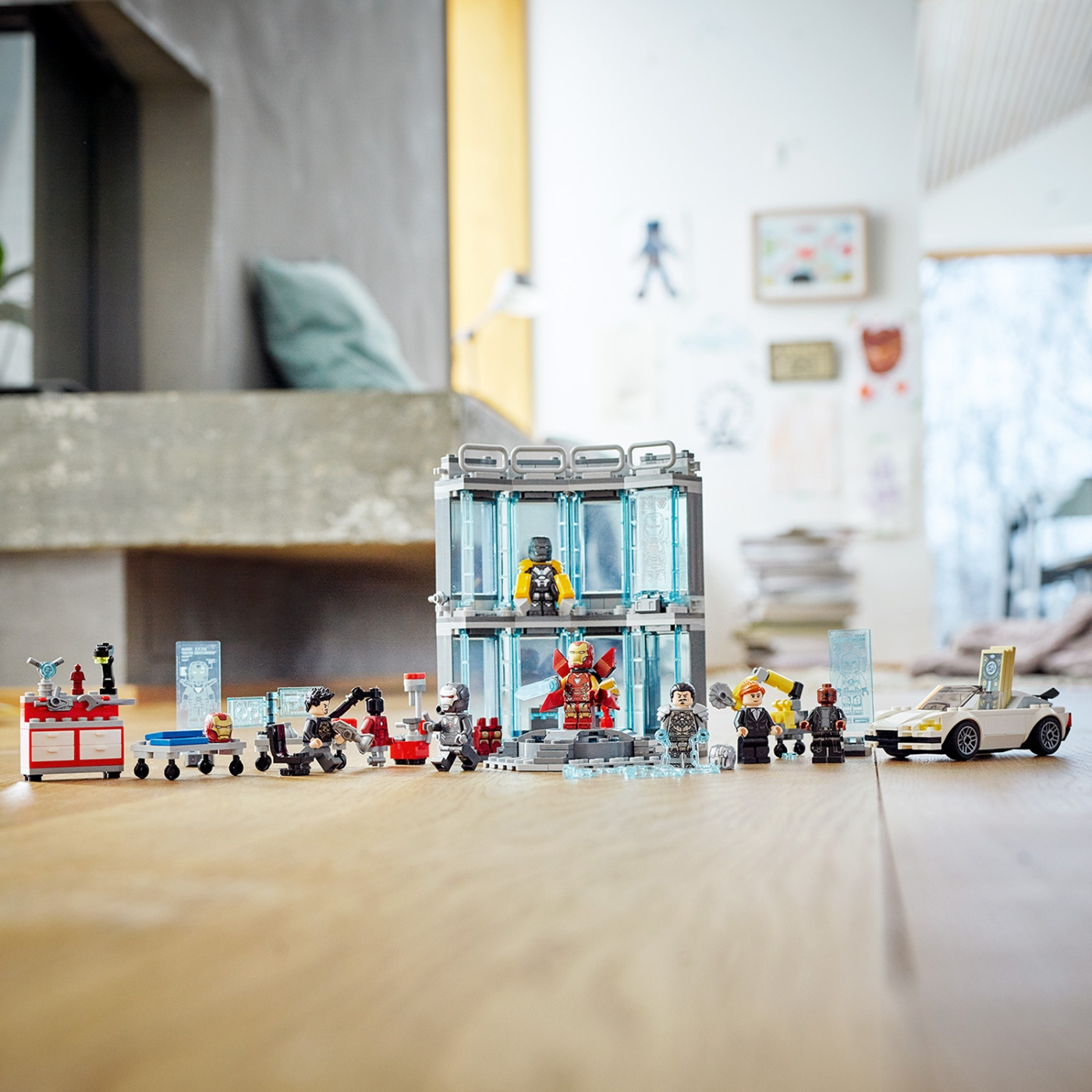 Detta mångsidiga och detaljrika lekset tar med barn in i det berömda rummet där Iron Man förvarar sina högteknologiska rustningar. Förutom de klassiska Iron Man-rustningarna MK3, MK25 och MK85 finns ett verkstadsområde med verktyg där barn kan utföra reparationer och en plattform där miljardärsuperhjälten kan byta om till sin valda rustning. Det finns även 3 holografiska skärmar, en sportbil, en robotarm, massor av tillbehör och populära minifigurer, däribland Tony Stark, Pepper Potts, Nick Fury, War Machine och Whiplash.