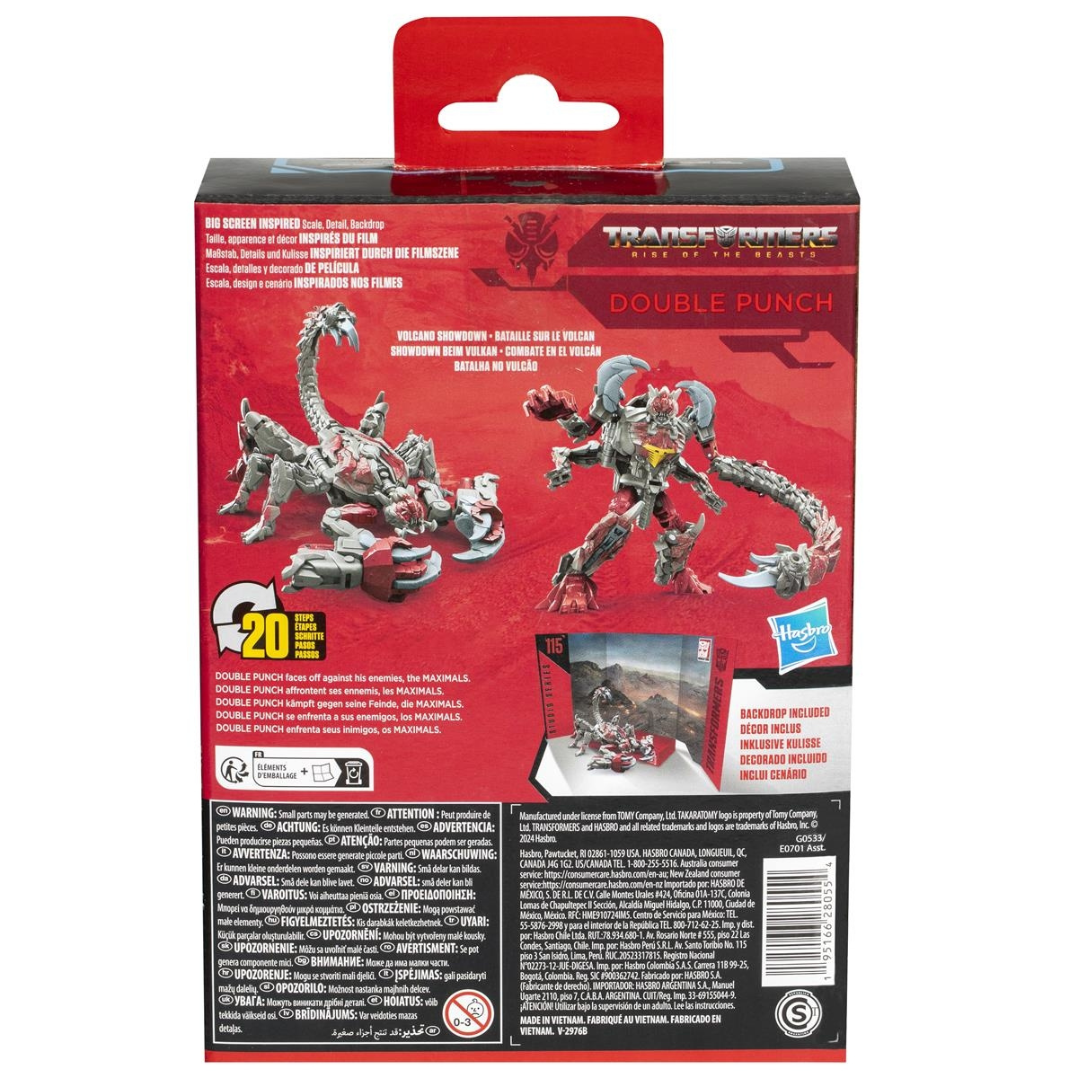 Experience the thrill of the Transformers movies with the Studio Series Deluxe Class Double Punch action figure. This collectible figure is inspired by Transformers: Rise of the Beasts and allows you to recreate epic scenes from the film. Transform the figure from robot to scorpion mode in 20 steps, and display it with the included Volcano Showdown backdrop for an immersive experience.