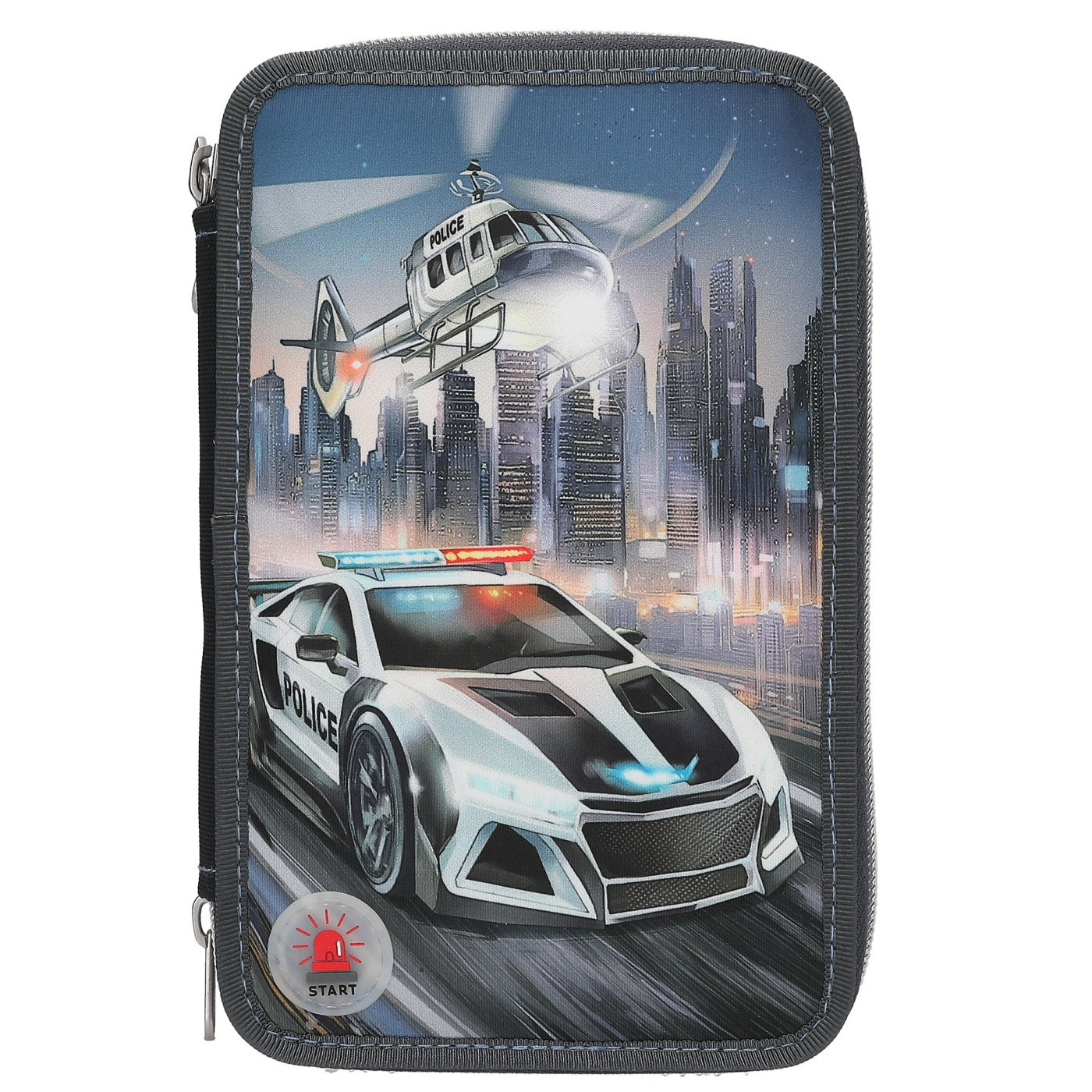 - Eye-Catching Motif: The front of this pencil case features a dynamic scene with a police racing car and a helicopter zooming across a night skyline. It's a design that screams speed and excitement, perfect for those who love a bit of adrenaline in their school day.
