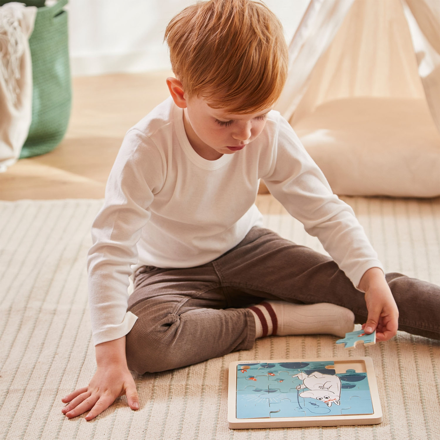 This 16-piece wooden puzzle offers a cozy and robust design, featuring a cute motif of Moomin jumping in his bed. It provides many hours of engaging play and development for young children. As they piece together the puzzle, children enhance their visual perception and fine motor skills, making it an excellent developmental tool. Suitable for children aged 2 years and older, this puzzle is a wonderful way to combine fun and learning.