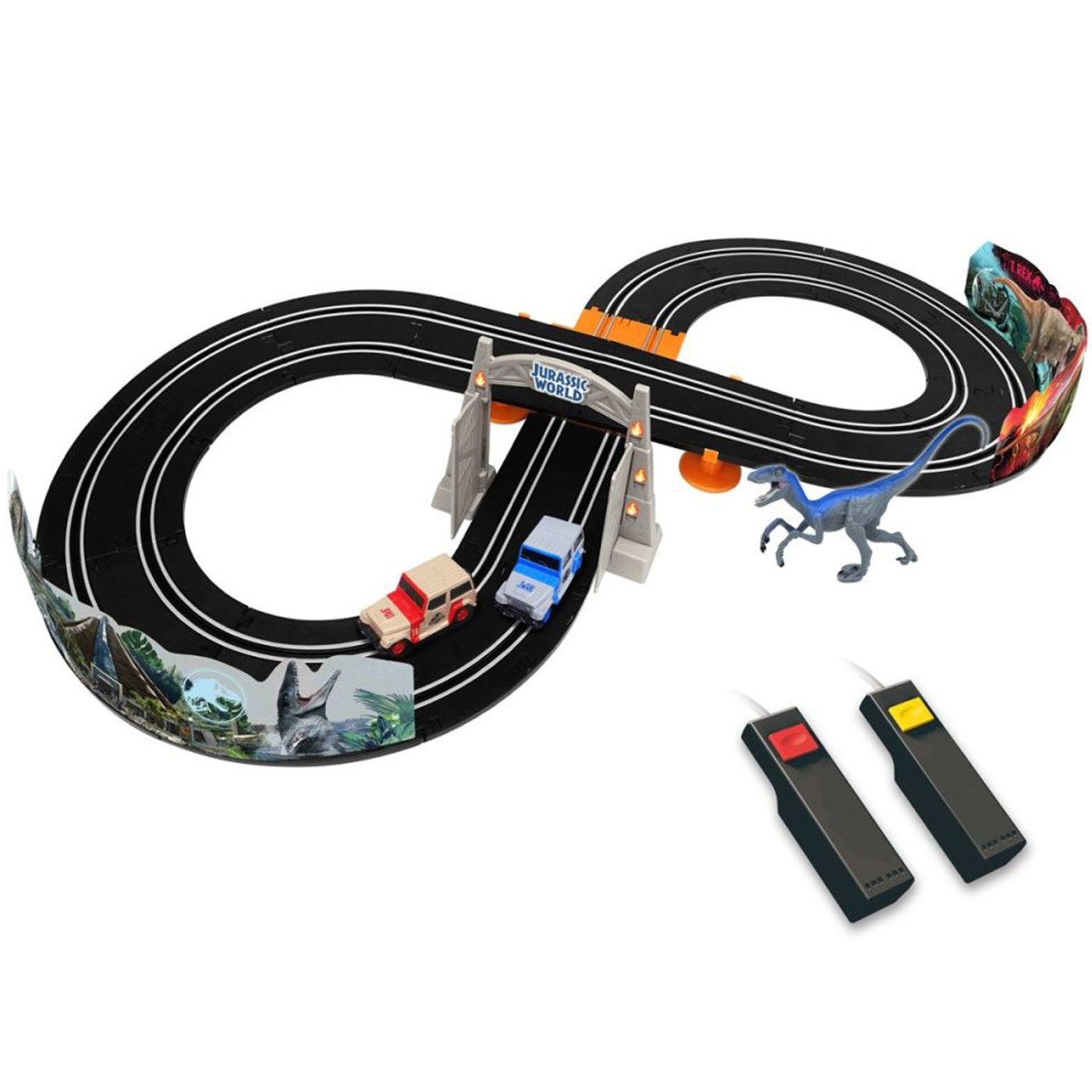 Gör dig redo för mer spänning och äventyr med Jurassic World race-track! Detta set innehåller 2 fordon, 2 hastighetskontroller, 2,4 meter spår